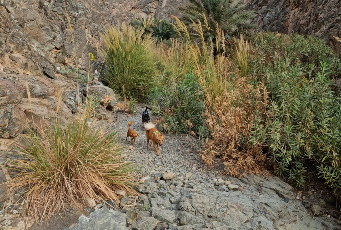 It’s a wadi walk that includes some fun bouldering that we love. For low confidence dogs this might be a challenge, but a good challenge, so take the time to help your dog overcome each boulder.