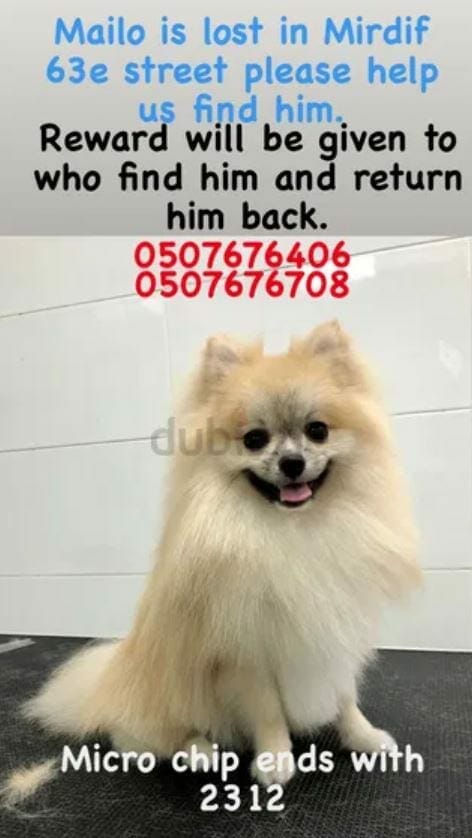 Mailo is lost in Mirdif 63e street. Please help us find him
