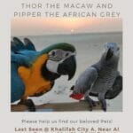 Blue and Golden Macaw and African Gray parrot. They flew out my balcony in Khalifa City A, near Al Forsan Cash reward for who finds and returns them